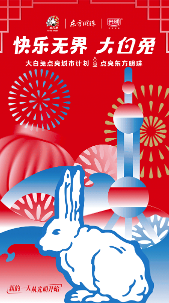 2023年1月17日——2月15日,“大白兔”攜手上海城市明星地標東方明珠廣播電視塔 聯合呈現“大白兔點亮東方明珠”新春活動 希望在兔年之際,用快樂和甜蜜點亮城市、點亮新一年的希望與快樂。